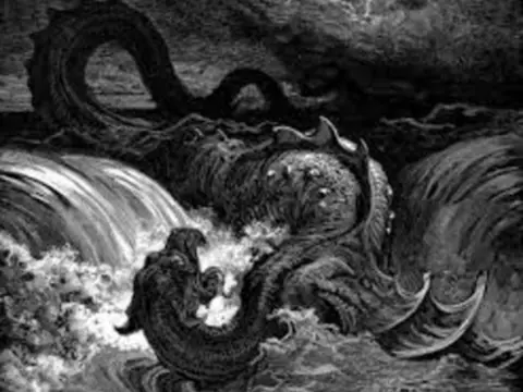 Leviatán, la bestia más espectacular de las bestias. Mezcla de serpiente de mar y ballena, creado por Dios y simboliza el mal. La serpiente marina, una versión nueva el caos- dragón Tiamat, Lotan de Ras Shamra un monstruo con siete